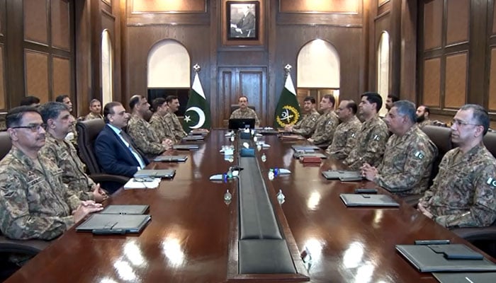 آرمی چیف جنرل سید عاصم منیر نے کہا ہے کہ جنگ مسلط کرنے کی کسی بھی کوشش کا یقینی اور فیصلہ کن جواب دیا جائے گا۔پاک فوج کے شعبہ تعلقات عامہ آئی ایس پی آر کا کہنا ہے کہ آرمی چیف جنرل عاصم منیر کی زیر صدارت خصوصی کور کمانڈرز کانفرنس ہوئی۔آرمی چیف جنرل سید عاصم منیر نے کور کمانڈرز کانفرنس سے خطاب کرتے ہوئے کہا کہ پاکستان کی مسلح افواج دفاع وطن کےلیے اپنی عوام کے ساتھ متحد ہو کر کھڑی ہیں۔آرمی چیف نے کہا کہ جنگ مسلط کرنے کی کسی بھی کوشش کا یقینی اور فیصلہ کن جواب دیا جائے گا۔فورم نے اعادہ کیا کہ پاکستان کے عوام کی امنگوں کا ہر قیمت پر احترام کیا جائے گا، بھارت کی جانب سے جان بوجھ کر عدم استحکام کی کوششوں کو قومی عزم اور واضح اقدامات سے شکست دی جائے گی۔شرکاء کانفرنس نے کہا کہ بھارت کو ان مذموم ہتھکنڈوں کے ذریعے اپنی دہشت گرد پراکسیز فعال کرنے میں ناکامی اٹھانی پڑے گی، پاکستان کے امن اور ترقی کا راستہ کسی بھی بلاواسطہ یا پراکسیز کے ذریعے نہیں روکا جاسکتا، پاکستان کے امن اور ترقی کا راستہ دہشت گردی، جبر یا جارحیت سے نہیں روکا جاسکتا۔بھارت کی جانب سے پانی کو بطور ہتھیار استعمال کرنا انتہائی خطرناک ہے،پانی کو بطور ہتھیار استعمال کرنے سے پاکستان کی 24 کروڑ آبادی متاثر ہوگی اور جنوبی ایشیا میں عدم استحکام میں اضافہ ہوگا۔شرکاء کانفرنس کا کہنا ہے کہ بھارتی فوج کی غیر انسانی اور بلا اشتعال کارروائیاں علاقائی کشیدگی کو بڑھاتی ہیں، بھارتی بلا اشتعال کارروائیوں کا مؤثر اور مناسب جواب دیا جائے گا، انتظامی ناکامیاں چھپانے کیلئے بھارت اندرونی مسائل کو بیرونی رنگ دیتا رہا ہے، پہلگام واقعہ کے بعد بھارتی افواج ایل او سی پر معصوم شہریوں کو مسلسل نشانہ بنا رہی ہے۔آئی ایس پی آر کے مطابق فورم نے خطے کی موجودہ صورتحال کا جامع جائزہ لیا اور بالخصوص پاک بھارت کشیدگی اور علاقائی سلامتی پر غور کیا۔فورم نے کسی بھی جارحیت یا مہم جوئی کے خلاف ملکی خود مختاری اور علاقائی سالمیت برقرار رکھنے کے غیر متزلزل عزم کا اعادہ کیا۔آئی ایس پی آر کے مطابق آرمی چیف نے مسلح افواج کی غیر متزلزل پیشہ وارانہ مہارت، ثابت قدم حوصلے اور آپریشنل تیاریوں کو سراہتے ہوئے تمام محاذوں پر چوکنا رہنے اور فعال تیاریوں کی اہمیت پر زور دیا۔فورم نے بھارت کے مقبوضہ جموں و کشمیر میں بھارتی مظالم اور سیاسی اور فوجی مقاصد کےلیے گھڑے جانے والے خود ساختہ بحرانوں پر اظہار تشویش کیا۔شرکاء کانفرنس نے کہا کہ اس طرح کے واقعات سے بھارت یکطرفہ چالوں سے اسٹیٹس کو کو تبدیل کرنے کی کوشش کرتا ہے، 2019 میں بھارت نے مقبوضہ کشمیر میں اسٹیٹس کو یکطرفہ تبدیل کرنے کی کوشش کے لیے پلوامہ ڈرامہ رچایا۔بھارت نے مقبوضہ کشمیر میں آرٹیکل 370 کی منسوخی کے ذریعے اسٹیٹس کو تبدیل کرنے کے لیے ڈرامہ رچایا، پہلگام واقعہ کا مقصد پاکستان کی توجہ مغربی سرحدوں، اقتصادی بحالی کی جاری کوششوں سے ہٹانا ہے، ان دو عوامل میں پاکستان فیصلہ کن اور پائیدار ترقی کی جانب گامزن ہے