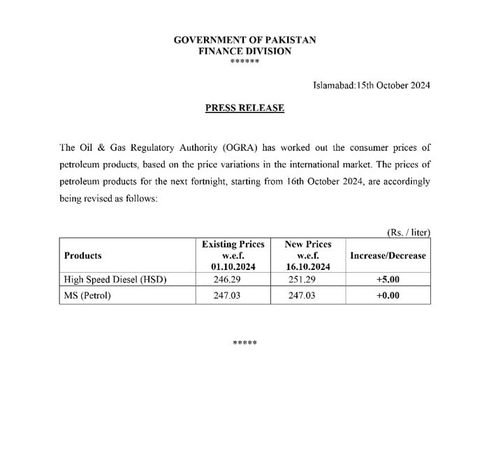 حکومت نے پیٹرولیم مصنوعات کی نئی قیمتوں کا اعلان کردیاحکومت نے آئندہ 15 روز کیلئے پیٹرولیم مصنوعات کی نئی قیمتوں کا اعلان کردیا۔حکومت نے ہائی اسپیڈ ڈیزل کی قیمت میں اضافہ اور پیٹرول کی قیمت برقرار رکھی ہے۔وزارت خزانہ نے پیٹرولیم مصنوعات کی نئی قیمتوں کا نوٹیفکیشن جاری کردیا جس کے مطابق ہائی اسپیڈ ڈیزل کی قیمت میں 5 روپے فی لیٹر اضافہ کر دیا گیا اور نئی قیمت 251 روپے 29 پیسے فی لیٹر مقرر کی گئی ہے۔پیٹرول کی قیمت 247 روپے 3 پیسے فی لیٹر پر برقرار ہے۔پیٹرولیم مصنوعات کی نئی قیمتوں کا اطلاق رات 12 بجے سے ہوگیا ہے