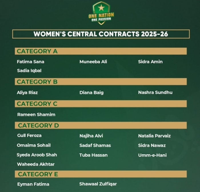 پاکستان کرکٹ بورڈ (پی سی بی) نے خواتین کرکٹرز کے لیے سینٹرل کنٹریکٹ 26-2025ء کا اعلان کر دیا۔خواتین ٹیم کی 20 کھلاڑیوں کو 5 کیٹیگریز میں کنٹریکٹس دیے گئے ہیں۔ ابھرتی کھلاڑیوں کیلئے ایمرجنگ کیٹیگری متعارف کروائی گئی ہے۔نوجوان کرکٹرز ایمان فاطمہ اور شوال ذوالفقار ایمرجنگ کیٹگری میں شامل ہیں اور تمام کیٹیگریز میں پلیئرز کے معاوضوں میں 50 فیصد اضافہ کیا گیا ہے، آئی سی سی ٹی ٹوئنٹی رینکنگ کی نمبر ون بولر سعدیہ اقبال، فاطمہ ثناء، منیبہ علی اور سدرہ امین کو کیٹیگری اے میں شامل کیا گیا۔کیٹیگری بی میں عالیہ ریاض، ڈیانا بیگ، نشرا سندھو کو اور کیٹیگری سی کا کنٹریکٹ رمین شمیم کو ملا ہے۔کیٹیگری ڈی میں گل فیروزہ، نجیہ علوی، ناتالیہ پرویز، عمائمہ سہیل، صدف شمس، سدرہ نواز، عروب شاہ، طوبیٰ حسن، ام ہانی اور وحیدہ اختر شامل ہیں