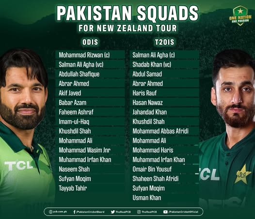 دورہ نیوزی لینڈ کیلئے قومی سکواڈ کا اعلان کردیا گیا، بابر اعظم اور رضوان ٹی 20 سکواڈ کا حصہ نہیں ہوں گے۔قومی کرکٹ ٹیم کے ہیڈ کوچ عاقب جاوید نے پریس کانفرس کرتے ہوئے بتایا کہ محمد رضوان سے ٹی 20 کی قیادت واپس لے لی گئی ہے، دورہ نیوزی لینڈ کے دوران سلمان علی آغا ٹی 20 ٹیم کے کپتان ہوں گے جبکہ شاداب خان کو نائب کپتان مقرر کیا گیا ہے۔انہوں نے بتایا کہ ون ڈے سکواڈ کی کپتان محمد رضوان کے پاس ہی رہے گی جبکہ سلمان آغا ون ڈے ٹیم میں نائب کپتان کے فرائض نبھائیں گے۔ہیڈ کوچ عاقب جاوید نے بتایا کہ ون ڈے سکواڈ میں محمد رضوان (کپتان) سلمان آغا (نائب کپتان)، عبداللہ شفیق، ابرار احمد ، عاکف جاوید، بابر اعظم، فہیم اشرف، امام الحق، خوشدل شاہ، محمد علی، محمد وسیم جونیئر، محمد عرفان خان، نسیم شاہ، سفیان مقیم اور طیب طاہر شامل ہیں۔