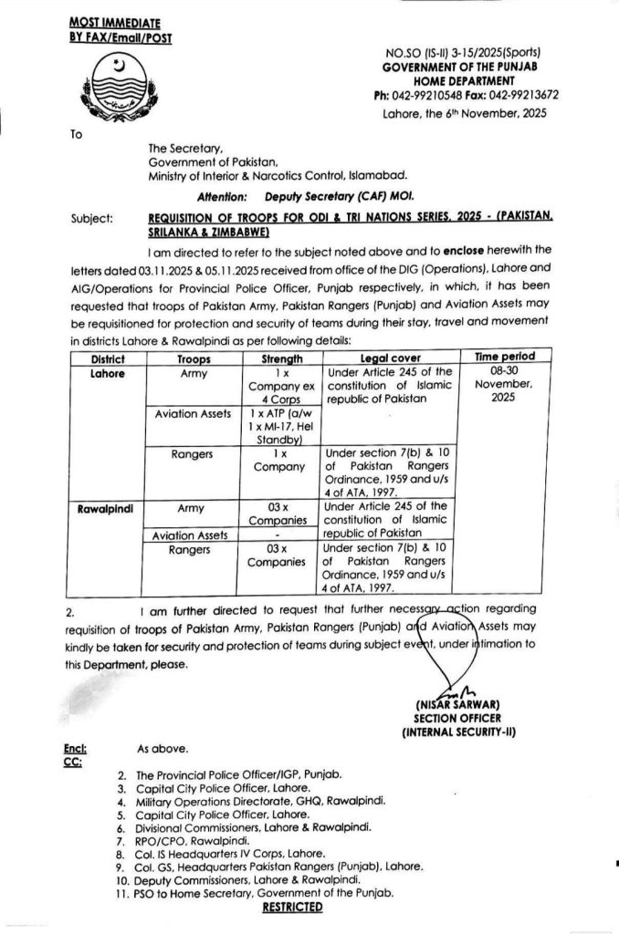 ترجمان محکمہ داخلہ پنجاب کے مطابق پاکستان، سری لنکا اور زمبابوے کے درمیان ہونے والی سہ ملکی کرکٹ سیریز کیلئے سکیورٹی پلان مکمل کر لیا گیا ہے۔محکمہ داخلہ پنجاب نے آرمی، رینجرز اور ایوی ایشن اثاثے طلب کر لیے ہیں۔بیان کے مطابق، لاہور اور راولپنڈی میں میچز کے دوران پولیس کے ساتھ پاکستان آرمی اور رینجرز کے دستے تعینات کیے جائیں گے تاکہ فول پروف سکیورٹی یقینی بنائی جا سکے۔لاہور میں آرمی اور رینجرز کی ایک، ایک کمپنی خدمات انجام دے گی۔راولپنڈی میں آرمی اور رینجرز کی تین، تین کمپنیاں تعینات ہوں گی۔لاہور میں آرمی ایوی ایشن کے ہیلی کاپٹرز بھی فضائی نگرانی کیلئے استعمال کیے جائیں گے۔فوج اور رینجرز کی تعیناتی آئین کے آرٹیکل 245 اور پاکستان رینجرز آرڈیننس 1959 کے تحت عمل میں لائی جائے گی۔ترجمان کے مطابق، سیریز کے میچز 11 نومبر سے 27 نومبر تک لاہور اور راولپنڈی میں شیڈول ہیں، جبکہ سکیورٹی دستوں کی خدمات 8 نومبر سے 30 نومبر تک حاصل کی جائیں گی۔محکمہ داخلہ پنجاب نے وفاقی وزارت داخلہ کو تعیناتی کیلئے مراسلہ ارسال کر دیا ہے اور تمام متعلقہ اداروں کو ٹیموں کی سکیورٹی اور دیگر انتظامات بروقت مکمل کرنے کی ہدایت جاری کر دی گئی ہے۔
