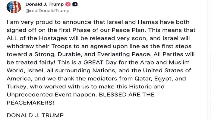 منصفانہ برتاؤ کیا جائے گاانہوں نے کہا کہ یہ عربوں، مسلم دنیا، اسرائیل، پڑوسی اقوام اور امریکا کے لیے عظیم دن ہے۔ امریکی صدر نے قطر، مصر اور ترکیہ کے ثالثوں سے اظہار تشکر کرتے ہوئے کہا کہ انہوں نے یہ تاریخی اور غیرمعمولی واقعہ رونما کیا ہے۔ ساتھ ہی کہا کہ امن قائم کرنے والوں پر رحمت ہو۔ڈونلڈ ٹرمپ کا کہنا تھا کہ ڈیل کا مطلب یہ ہے کہ تمام یرغمالی جلد رہا کردیے جائیں گے اور اسرائیل ایک مضبوط، پائیدار اور لازوال امن کی طرف پہلے قدم کے طور پر اپنی فوج کا متفقہ لائن پر انخلا کرے گا۔ قطر کی وزارت خارجہ کے ترجمان نے بھی تصدیق کی ہے کہ پہلے مرحلے کے تمام نکات طے کرلیے گئے ہیں۔ اب توقع کی جانی چاہیے کہ جنگ روکی جائے گی۔قطری وزارت خارجہ کے مطابق اسرائیلی یرغمالیوں اور فلسطینی قیدیوں کو رہائی دی جائے گی اور غزہ میں امداد داخل ہونے دی جائے گیحماس رہنما نے عرب میڈیا کو بتایا کہ تمام زندہ قیدی ایک ساتھ رہا کیے جائیں گے۔ تاہم مردہ قیدیوں کی لاشوں کو حوالے کیا جانا تاخیر کا شکار ہوسکتا ہے۔اپنے بیان میں حماس نے ٹرمپ اور ضامن ریاستوں سے اسرائیل کی جانب سے غزہ جنگ بندی معاہدے پر عمل درآمد کو یقینی بنانے کا مطالبہ کیا ہے۔دوسری جانب اسرائیلی حکام کو اس بات پر شکوک ہیں کہ مردہ یرغمالیوں کی باقیات حماس آسانی سے تلاش کرسکے گی بھی یا نہیں۔
