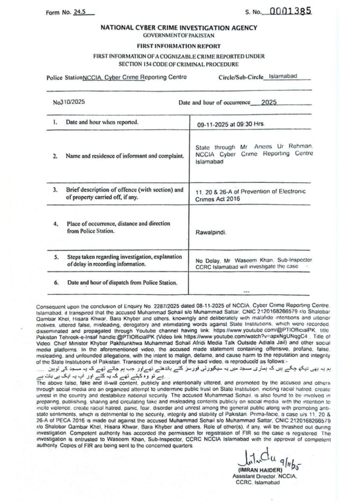 خیبر پختون خواہ کے وزیر اعلیٰ سہیل آفریدی کے خلاف این سی سی آئی اے نے پیکا ایکٹ کے تحت ایف آئی آر درج کرلی پے، سہیل آفریدی کے خلاف مقدمہ مساجد میں کتے باندھنے اور حساس اداروں کے خلاف بےبنیاد الزامات لگانے پر سرکار کی مدعیت میں درج کیا گیا ہے، سائبر کرائم رپورٹنگ سینٹر اسلام آباد میں نیشنل سائبر کرائمز انویسٹی گیشن ایجنسی (این سی سی آئی اے) کے سب انسپکٹر کی مدعیت میں مقدمہ درج کیا گیا۔سائبرکرائم ایکٹ کے تحت درج مقدمے کے متن کے مطابق سوشل میڈیا پر موجود ویڈیوز میں ریاست ، قومی سلامتی کے اداروں کی ساکھ کو نقصان پہنچانے کی کوشش کی گئی۔متن کے مطابق وزیراعلیٰ کے پی نے اڈیالہ جیل کے باہر ریاستی اداروں کے خلاف جھوٹ پر مبنی میڈیا ٹاک کی اور پی ٹی آئی کے آفیشل پیج سے ریاستی اداروں کے خلاف ویڈیو کو پھیلایا گیا