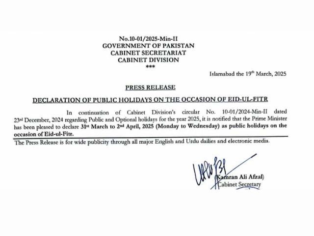 وفاقی حکومت نے عید الفطر کی تعطیلات کا اعلان کردیا۔ وفاقی حکومت کی جانب سے عید الفطر پر تین تعطیلات کا اعلان کیا گیا ہے جو پیر 31 مارچ سے بدھ 2 اپریل تک ہوں گی۔کابینہ ڈویژن نے سرکاری تعطیلات کا نوٹیفکیشن بھی جاری کردیا ہے تاہم صوبوں کی جانب سے اب تک عید کی تعطیلات کا اعلان نہیں کیا گیا ہے