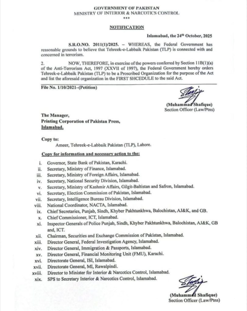 وزارت داخلہ نے تحریک لبیک پاکستان (ٹی ایل پی) کو کالعدم جماعت قرار دیتے ہوئے فرسٹ شیڈول کی فہرست میں شامل اور پابندی لگانے کا نوٹیفکیشن جاری کردیا۔نوٹیفکیشن میں کہا گیا ہے کہ وفاقی حکومت سمجھتی ہے ٹی ایل پی دہشت گردی میں ملوث ہے، وزارت داخلہ نے انسداد دہشت گردی ایکٹ کے تحت ٹی ایل پی کو کالعدم قرار دیا ہے۔وزارت داخلہ کے نوٹیفکیشن کے بعد ٹی ایل پی کو اب کالعدم جماعت قرار دے دیا گیا ہے، وزارت داخلہ کی رپورٹ وزرات قانون کو بھجوائی جائے گی، وزرات قانون ریفرنس تیار کر کے سپریم کورٹ میں جمع کرائے گا۔اس حوالے سے جاری ہونے والے نوٹیفکیشن میں کہا گیا ہے کہ وفاقی حکومت کے پاس ٹھوس وجوہات موجود ہیں کہ ٹی ایل پی کے تانے بانے دہشتگردی سے ملتے ہیں۔واضح رہے کہ اس سے قبل گزشتہ روز وفاقی کابینہ نے ٹی ایل پی پر پابندی کی منظوری دی تھی، یہ منظوری وزیراعظم شہباز شریف کی زیر صدارت ہونے والے اجلاس میں دی گئی تھی۔