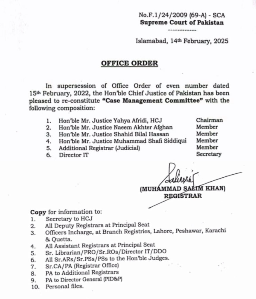 چیف جسٹس آف پاکستان یحییٰ آفریدی نے نئی کیس مینجمنٹ کمیٹی تشکیل دے دی۔چیف جسٹس یحییٰ خان آفریدی 6 رکنی کمیٹی کے سربراہ ہوں گے۔