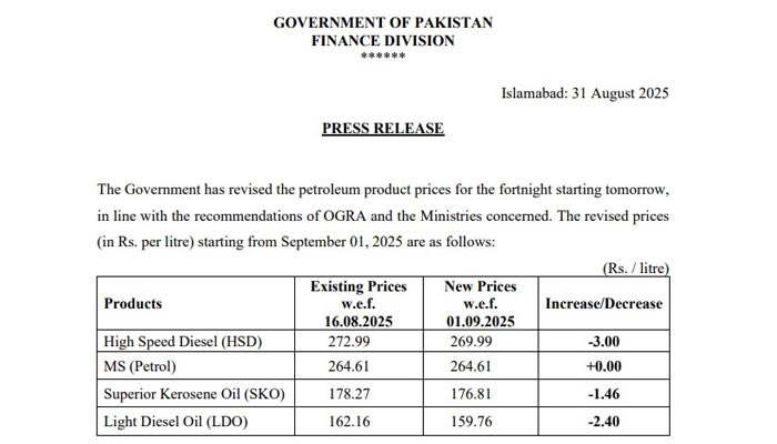 حکومت نے پٹرولیم مصنوعات کی نئی قیمتوں کا اعلان کردیا۔وزارت خزانہ کی جانب سے جاری نوٹیفکیشن کے مطابق ہائی سپیڈ ڈیزل کی قیمت میں 3 روپے کمی کی گئی، پٹرول کی قیمت کو برقرار رکھا گیا ہے جبکہ لائٹ ڈیزل کی قیمت میں 2 روپے 40 پیسے کمی کی گئی۔حکومت کی جانب سے آئندہ 15 روز کے لئے پٹرولیم مصنوعات کی فی لٹر قیمتیں مقرر کی گئی ہیں، پٹرول کی قیمت کو 264 روپے 61 پیسے برقرار رکھا گیا ہے۔ہائی سپیڈ ڈیزل کی قیمت 3 روپے فی لٹر کی کمی کے