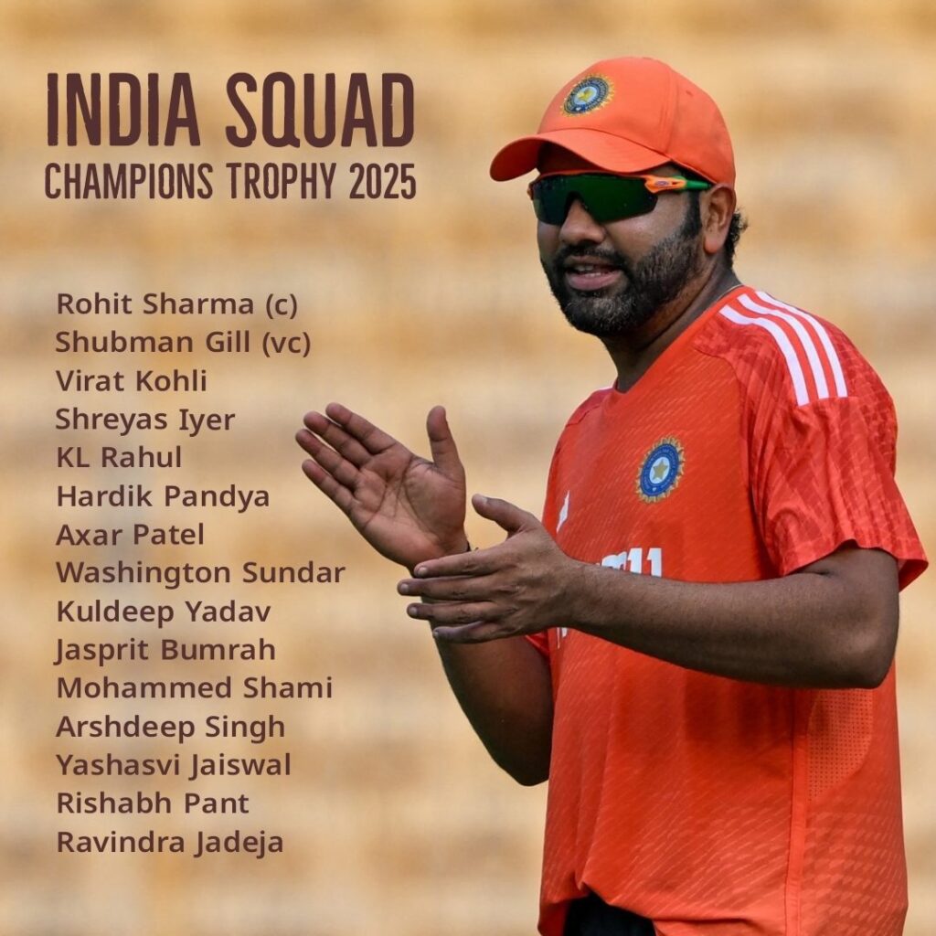 انٹرنیشنل کرکٹ کونسل (آئی سی سی) چیمپئنز ٹرافی کے لیے بھارت نے اسکواڈ کا اعلان کر دیا۔ چیمپئنز ٹرافی کے لیے بھارتی ٹیم کا روہت شرما کو کپتان اور شبمن گل کو نائب کپتان مقرر کیا گیا ہے۔بھارتی ٹیم کے کپتان روہت شرما اور چیف سلیکٹر اجیت اگرکر نے پریس کانفرنس کے دوران اسکواڈ کا اعلان کیا. ویرات کوہلی، شریاس ایئر، کے ایل راہول اور ہاردیک پانڈیا اسکواڈ میں شامل ہیں۔اکشر پٹیل، واشنگٹن سندر، کلدیپ یادیو، جسپریت بمراہ بھی اسکواڈ کا حصہ ہیں۔اس کے علاوہ محمد شامی، ارشدیپ سنگھ، یشسوی جیسوال، رشبھ پنت اور رویندرا جڈیجا بھی اسکواڈ میں شامل ہیں