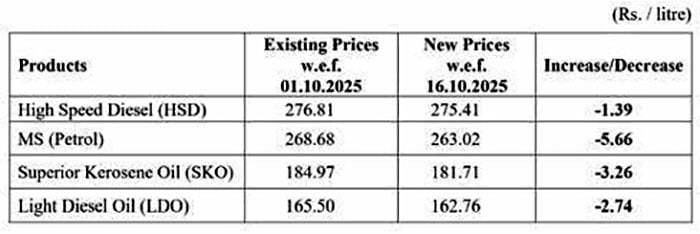 وزارتِ خزانہ کے نوٹیفکیشن کے مطابق پیٹرول کی قیمت میں 5 روپے 66 پیسے فی لیٹر کمی کی گئی ہے جس کے بعد پیٹرول کی نئی قیمت 263 روپے 2 پیسے فی لیٹر ہو گی، ڈیزل کی قیمت میں 1 روپے 39 پیسے فی لیٹر کمی کی گئی ہے جس کے بعد ڈیزل کی نئی قیمت 275 روپے 41 پیسے فی لیٹر مقرر ہو گئی۔مٹی کے تیل کی قیمت میں 3 روپے 26 پیسے فی لیٹر کمی کی گئی ہے جس کے بعد مٹی کے تیل کی نئی قیمت 181 روپے 71 پیسے فی لیٹر ہو گئی، اسی طرح لائٹ ڈیزل آئل کی قیمت میں 2 روپے 74 پیسے فی لیٹر کمی کی گئی ہے جس کی نئی قیمت 162روپے 76 پیسے فی لیٹر مقرر ہو گئی ہے۔وزارتِ خزانہ کے نوٹیفکیشن میں کہا گیا ہے کہ پیٹرولیم مصنوعات کی نئی قیمتوں کا اطلاق آج رات سے ہو گا