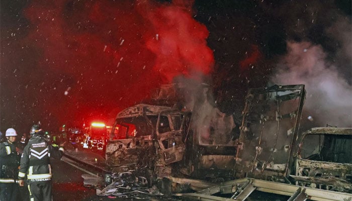 جاپان میں ہونے والے خطرناک حادثے میں 56 گاڑیاں آپس میں ٹکرا گئیں، کئی گاڑیوں میں آگ لگ گئی واقعے میں 1خاتون ہلاک اور 26 افراد زخمی ہوگئے۔بین الاقوامی ذرائع کے مطابق شاہراہ پربرف باری، پھسلن سے 2 ٹرک ٹکرائے جس کے بعد دیگر گاڑیاں ایک دوسرے سے ٹکراتی چلی گئیں۔ریسکیو حکام کے مطابق برف باری اور پھسلن کے باعث امدادی کاموں میں مشکلات کا سامنا ہے۔حکام کا کہنا ہے کہ سڑک تاحال معمول کی ٹریفک کے لیے بند کردی گئی ہے۔حادثے میں زخمی ہونے والے 26 افراد کو اسپتال منتقل کردیا گیا ہے۔حادثے میں ہلاک ہونے والی 77 سالہ خاتون کا تعلق ٹوکیو سے بتایا جاتا ہے