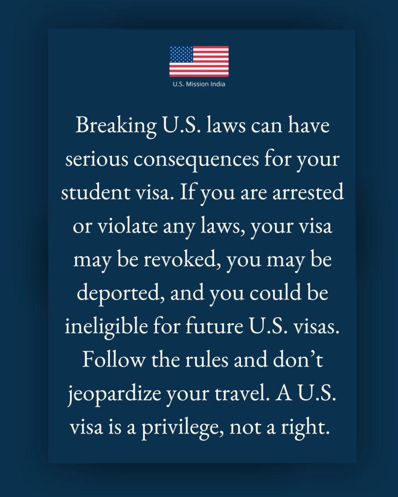 نے ملک میں زیر تعلیم طلبہ سے متعلق بیان میں کہا کہ اگر گرفتار کیا گیا یا آپ کسی بھی قانون کی خلاف ورزی کی تو آپ کا ویزا منسوخ ہو سکتا ہے۔سفارتخانے نے مزید کہا کہ آپ کو ملک بدر کیا جا سکتا ہے اور مستقبل میں امریکی ویزا کے لیے نااہل بھی قرار دیا جا سکتا ہے، لہٰذا قوانین کی پابندی کریں اور اپنے سفر اور تعلیمی مواقع کو خطرے میں نہ ڈالیں۔بھارت میں موجود امریکی سفارتخانے نے یہ بھی کہا کہ امریکی ویزا استحقاق ہے، حق نہیں۔بھارتی میڈیا کا کہنا ہے کہ امریکی سفارتخانے کی جانب سے یہ وارننگ ایسے وقت میں سامنے آئی ہے، جب گزشتہ برس جون میں نیو یارک ایئرپورٹ پر ایک بھارتی طالب علم کی ہتھکڑی لگی ویڈیو وائرل ہوئی تھی۔رپورٹس میں دعویٰ کیا گیا تھا کہ مذکورہ شخص بغیر درست ویزا کے غیر قانونی طور پر امریکا میں داخل ہوا تھا، جس کے بعد اسے ملک بدر کر دیا گیا