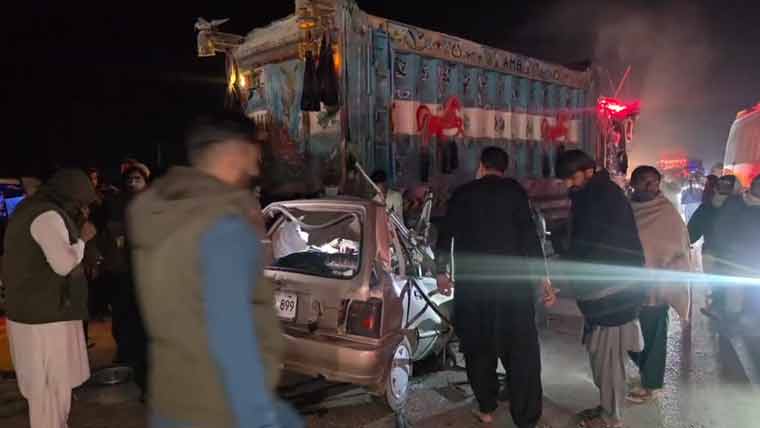 کوٹری سائٹ روڈ پر کار اور ٹرک میں خوفناک تصادم ہوا جس کے نتیجے میں بچوں سمیت 8 افراد جان کی بازی ہار گئے۔ذرائع کے مطابق جاں بحق ہونے والوں میں 10 سالہ طورا بی بی ولد رضا خان، 7 سالہ شاہ زیب ولد غلام حیدر، 5 سالہ عالم خان ولد غلام حیدر، 50 سالہ غلام حیدر ولد مرزا خان، 45 سالہ رضا خان ولد مرزا خان، 40 سالہ مسمات ثمینہ ولد روزی خان، 5 سالہ جنت بی بی ولد رضا خان، 45 سالہ صالی زوجہ غلام حیدر شامل ہیں۔ایس ایس پی کے مطابق حادثے کے نتیجے میں 2 افراد زخمی بھی ہوئے، جبکہ جاں ہونے والے تمام افراد کا تعلق ایک ہی فیملی سے ہے، لاشوں اور زخمیوں کو ہسپتال منتقل کر دیا گیا ہے۔انہوں نے مزید بتایا کہ ٹرک ڈرائیور کو حراست میں لے لیا گیا ہے، ابتدائی طور پر حادثے کی وجہ معلوم نہ ہوسکی، تاہم اس حوالے سے مزید تفتیش جاری ہے۔