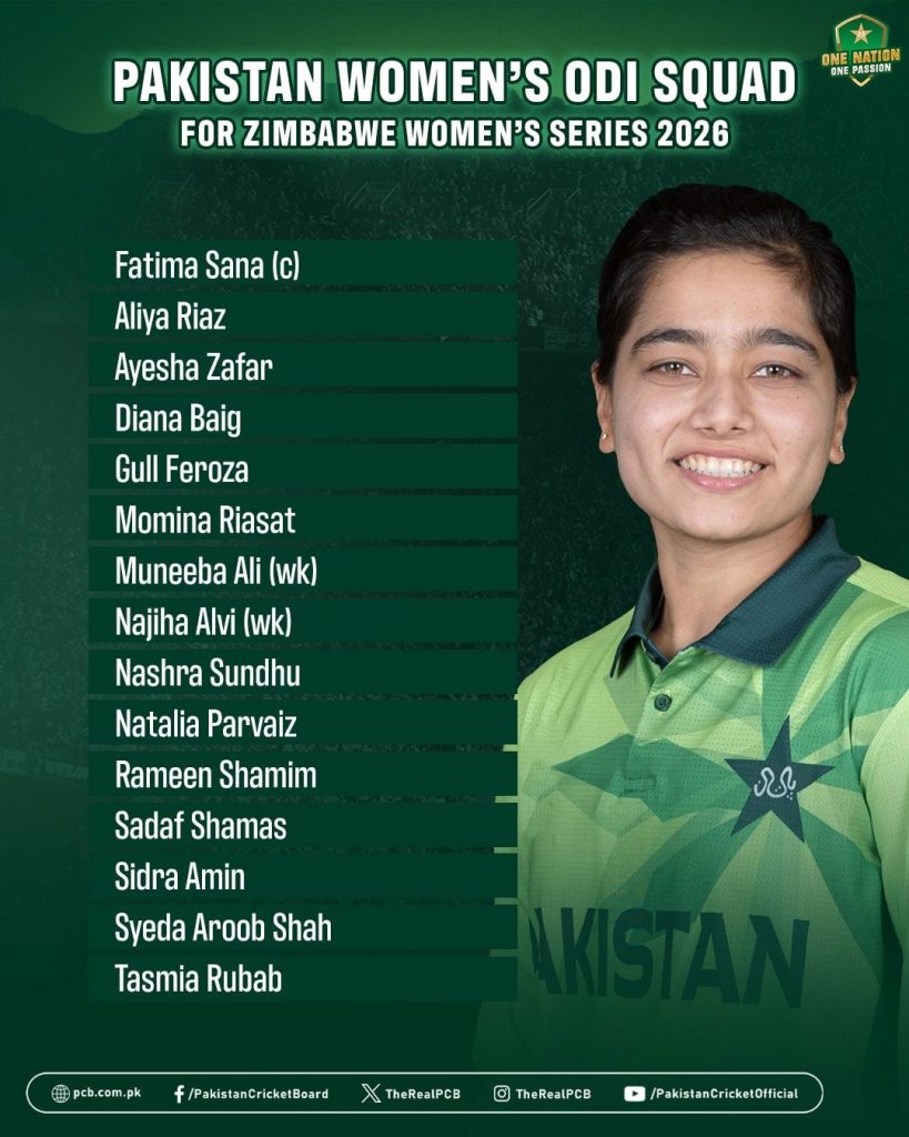 زمبابوے کے خلاف ون ڈے سیریز کے لیے پاکستان ویمن ٹیم کا اعلان کر دیا گیا، قومی ویمن ٹیم کی قیادت فاطمہ ثناء کریں گی۔زمبابوے ویمن ٹیم پہلی مرتبہ وائٹ بال سیریز کے لیے پاکستان کا دورہ کر رہی ہے، ون ڈے سیریز کے لیے قومی ویمن ٹیم کے 15 رکنی اسکواڈ میں کپتان فاطمہ ثناء، عالیہ ریاض، عائشہ ظفر، ڈیانا بیگ، مومنہ ریاست، منیبہ علی، نجیہہ علوی، نشرہ سندھو، نتالیا پرویز، رامین شمیم، صدف شمس، سدرا امین، سیدہ عروب شاہ اور تسمیعہ رباب شامل ہیںمومنہ ریاست کو پہلی مرتبہ ون ڈے میں ٹیم میں شامل کیا گیا ہے، پاکستان اور زمبابوے ویمن ٹیمز کے درمیان ون ڈے سیریز 4 سے 9 مئی تک نیشنل بینک اسٹیڈیم کراچی میں کھیلی جائے گی جبکہ ٹی 20 سیریز بھی 12 سے 15 مئی تک کراچی میں ہی ہو گی جس کے لیے اسکواڈ کا اعلان بعد میں کیا جائے گا۔زمبابوے ویمن ٹیم 29 اپریل کو کراچی پہنچے گی جبکہ پاکستان ویمن کرکٹ ٹیم آج سے اسٹیٹ بینک گراؤنڈ میں ٹریننگ کرے گی۔30 اپریل سے پاکستان اور زمبابوے دونوں ٹیمز نیشنل بینک اسٹیڈیم میں ٹریننگ کریں گی